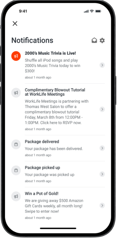The HqO notification center provides a centralized location to view all app notifications. This feature keeps you informed about updates and activities within your building, helping you stay connected and engaged.
